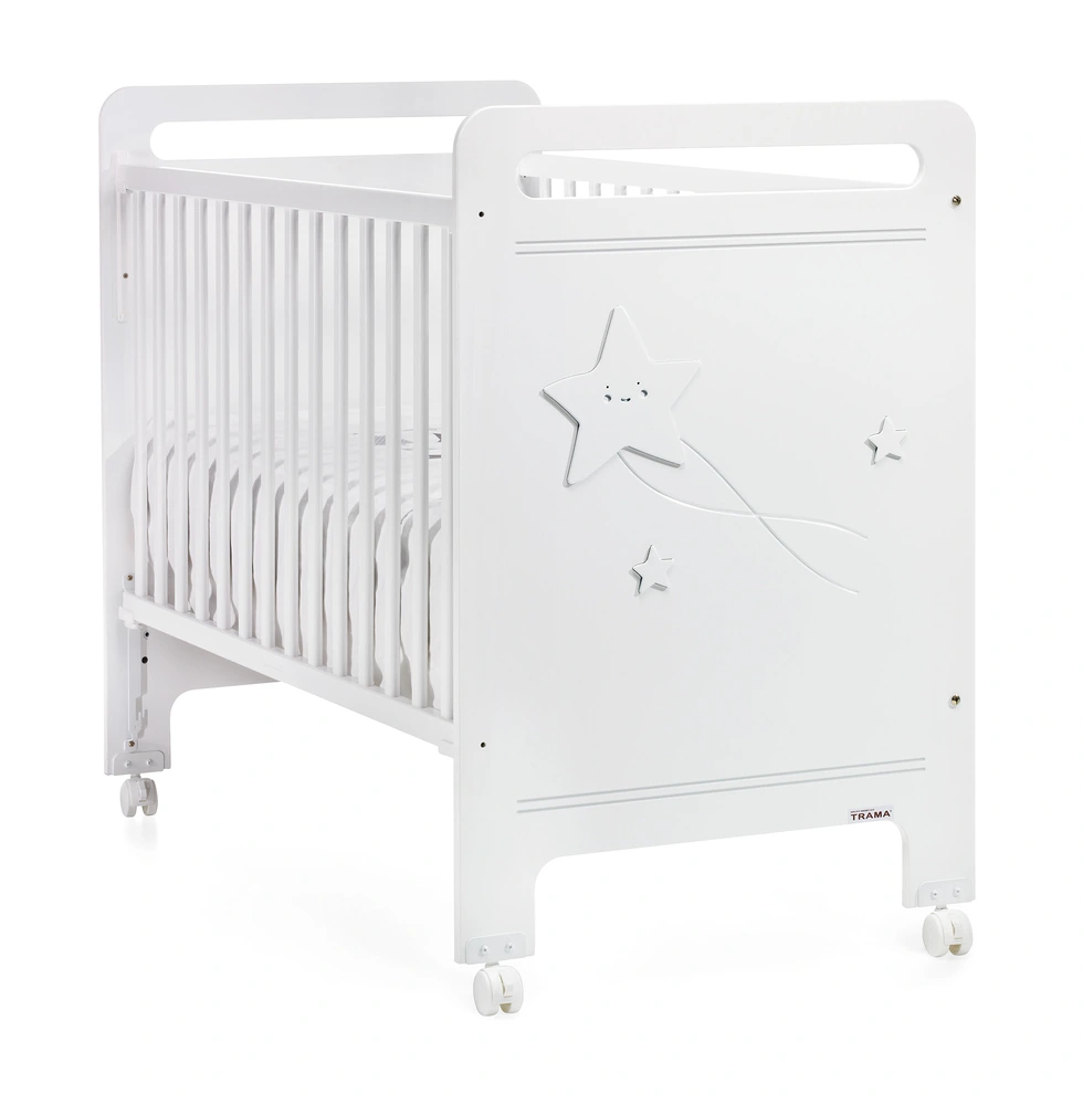 Dětská postýlka Trama GALAXIA má nastavitelnou výšku roštu do 5 poloh, což zaručuje pohodlnou manipulaci s miminkem po celou dobu používání dětské postýlky. Jedna bočnice postýlky je stahovací. Posuvný mechanismus bočnice má bezpečnostní pojistku a je možné ho ovládat pomocí jedné ruky.