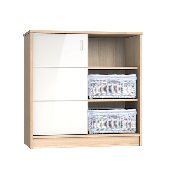 Součástí komody Faktum ALDA Classic jsou tři vnitřními police a dva praktické proutěné koše s textilní výplní. Posuvná dvířka jsou vybavena kvalitním kováním značky BLUM, mají vyfrézované úchyty.