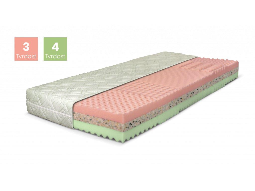 Mezi výrazně profilované vrstvy polyuretanové pěny je vložena deska z RE pěny, která zaručuje zvýšenou nosnost matrace.