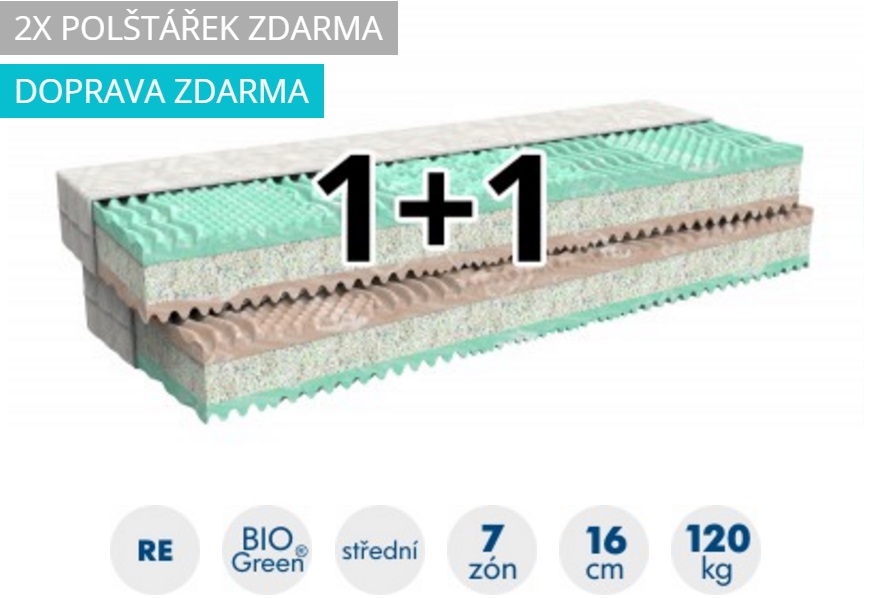 Jádro 7zónové matrace Marika je v horních profilových vrstvách vyrobeno ze značkové pěny BioGreen. Při výrobě matrace Marika je dbáno na životní prostředí používáním přírodních olejů z kokosových ořechů, lnu a lanolínu. Střední část matrace Marika je z lehčené PUR pěny, která zajistí optimální tuhost a ideální polohu těla. Hnědá strana matrace Marika klade vyšší odpor než strana zelená. Matrace je tímto univerzální, každý si zvolí stranu, která mu vyhovuje. Vhodným podkladem pro matraci Marika je rošt nebo pevná podložka. Nosnost matrace je 120 kg. Matrace je vhodná pro pevnou podložku i rošt. Uvedená cena je za 2 kusy matrací a 2 kusy polštářků