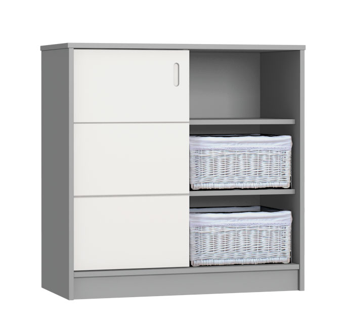 Kombinace šedého korpusu a bílých lesklých posuvných dvířek s frézováním dodává přebalovací komodě Faktum ALDA Grey luxusní a moderní vzhled.