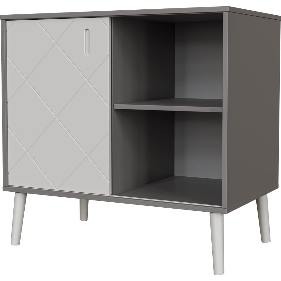 Komoda Faktum Peak Grey & White má praktické posuvné dveře s vyfrézovanými úchyty. Na levé i pravé straně komody je 1 police.