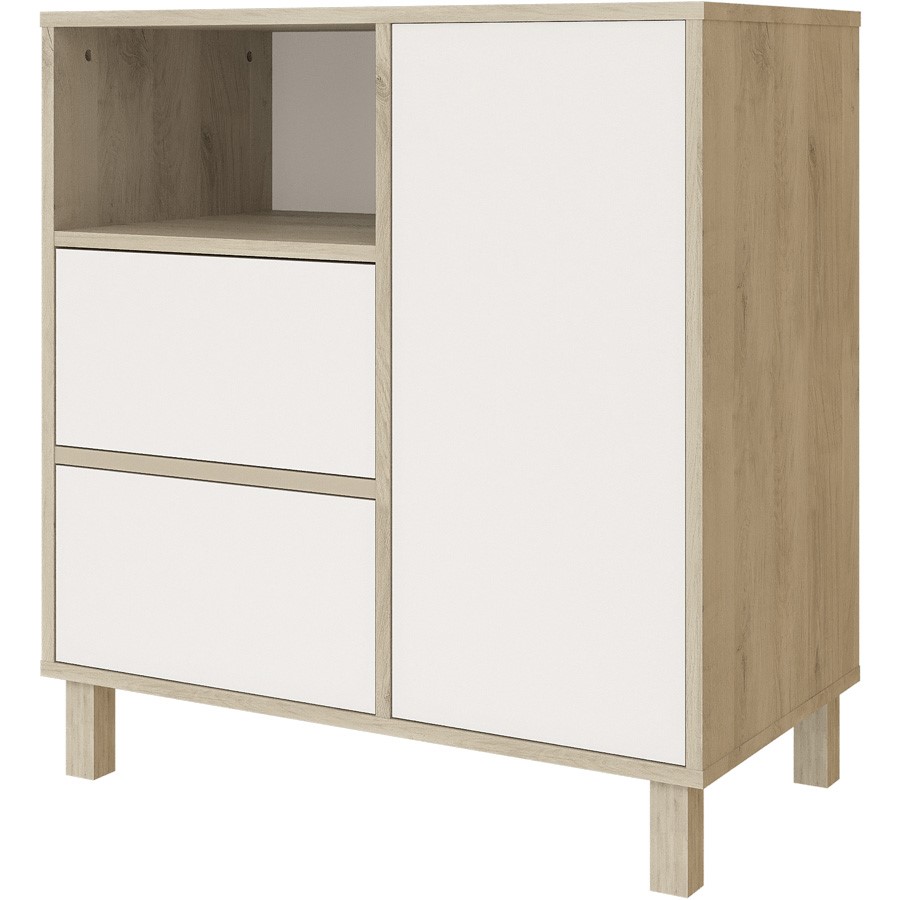 Komoda Faktum Wing Grey Oak & White je vybavena 2 zásuvkami a 1 policí v levé části a 1 policí v pravé části.
